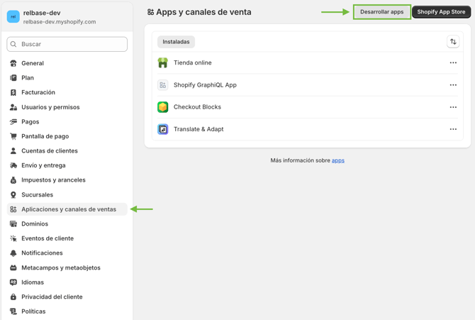 Se debe ingresar a la cuenta de Shopify y dirigirse a: Configuración → Aplicaciones y canales de ventas → Desarrollar aplicaciones.